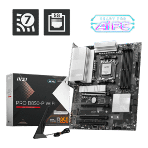 La PRO B850-P WIFI ofrece un diseño sencillo con una armoniosa paleta de colores plateados que combina a la perfección con ordenadores de sobremesa blancos y negros. Está diseñada con numerosas características exclusivas de MSI, como Wi-Fi 7 con EZ Antenna, LAN 5G, PCIe 5.0 M.2 con EZ M.2 Shield Frozr II y alimentación PCIe adicional, compatible con los procesadores AMD Ryzen™ serie 9000.